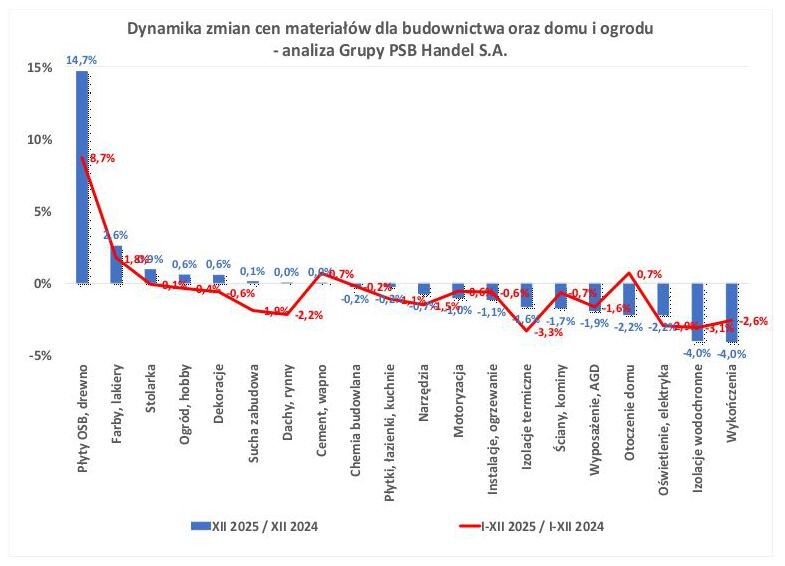 cen (I-XII), odnotowano wzrost w 4 grupach towarowych. Największe podwyżki dotyczyły kategorii płyty OSB, drewna (+9%).