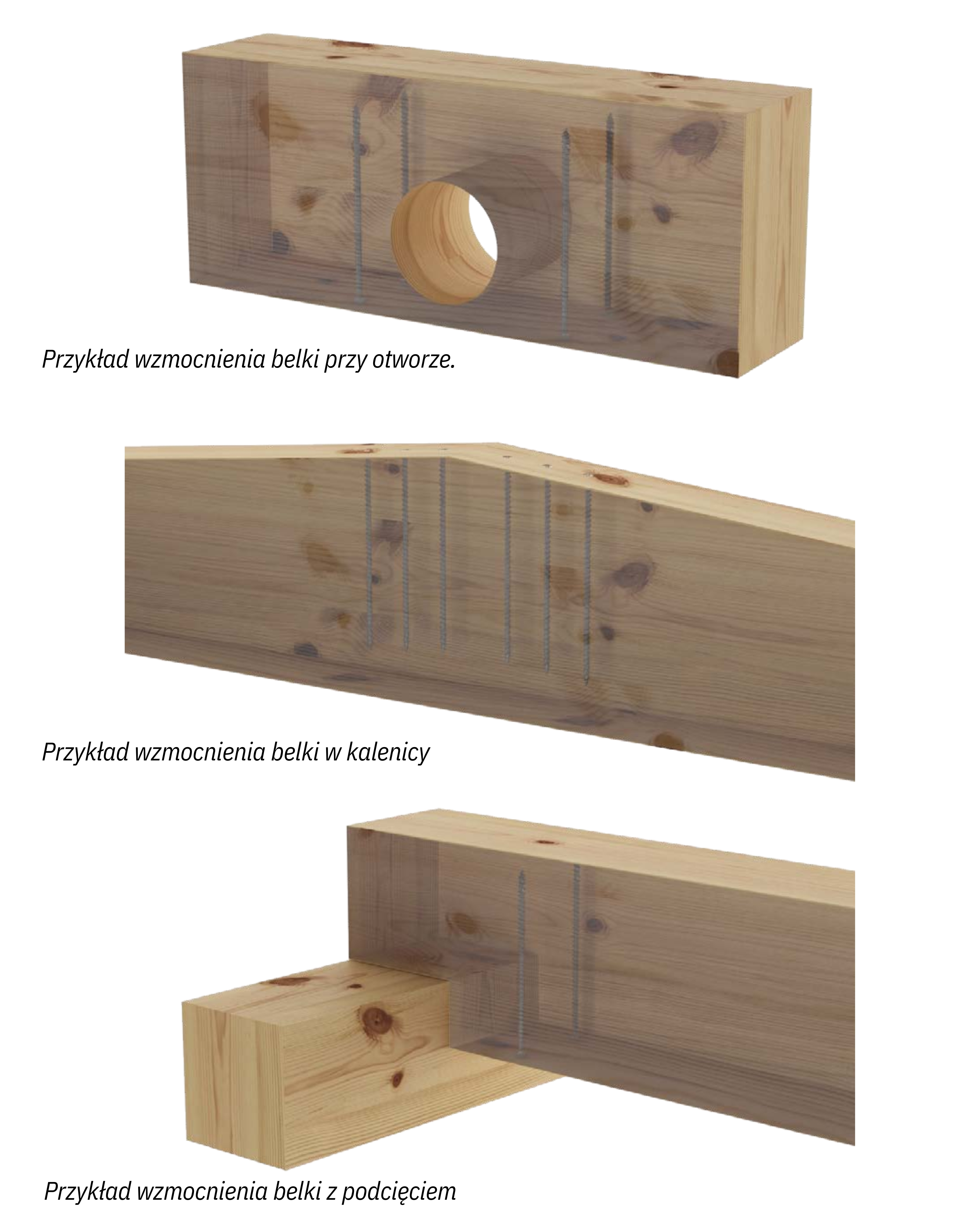 Tego typu wkręty wykorzystywane są do wzmacniania belek, w miejscach osłabionych konstrukcji gdzie występują np. otwory przepustów, podcięcia belek. oraz przy modernizacji istniejących konstrukcji. W wielu przypadkach skutecznie zastępują klasyczne złącza stalowe, upraszczając konstrukcję i skracając czas montażu.
