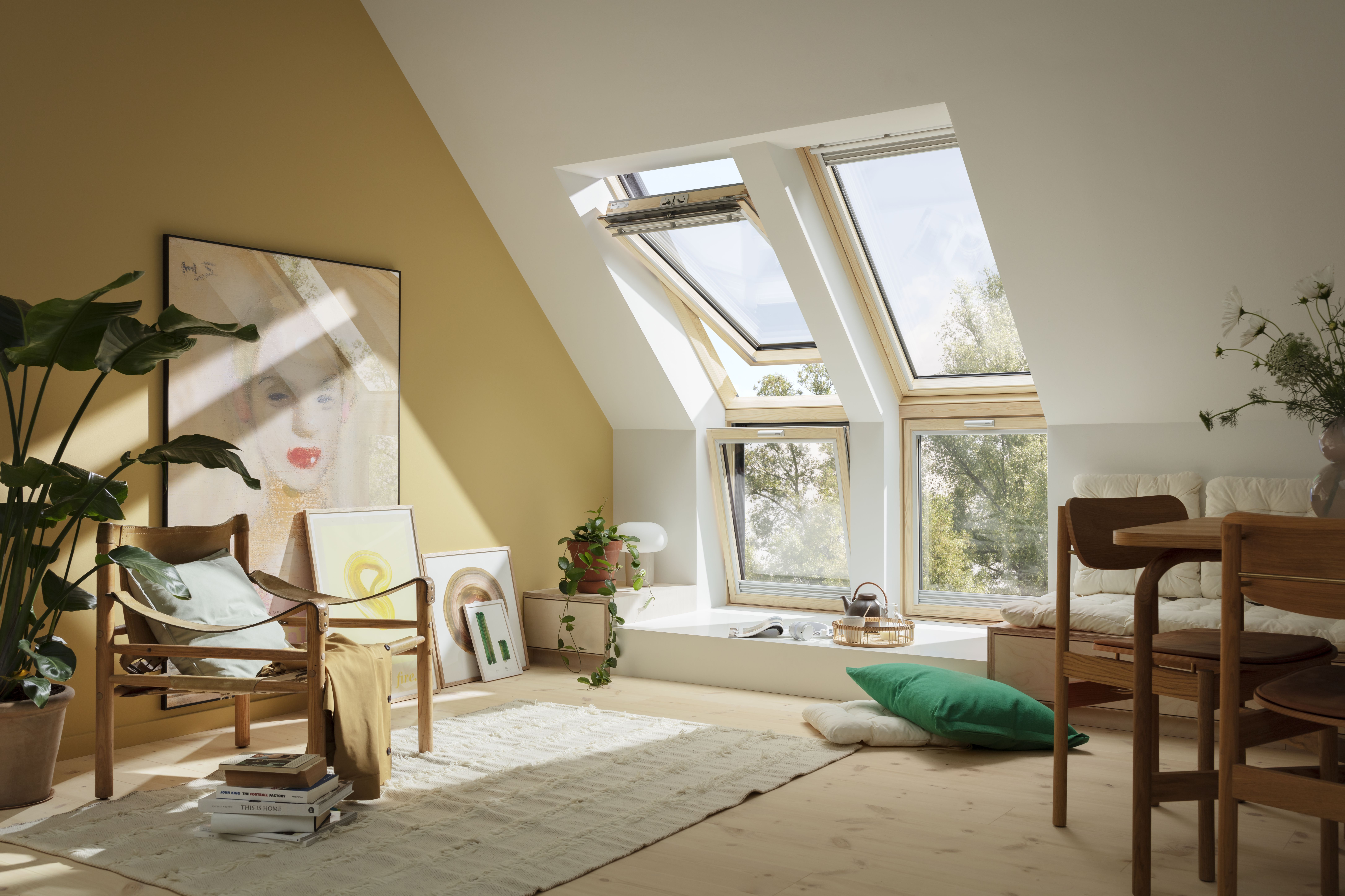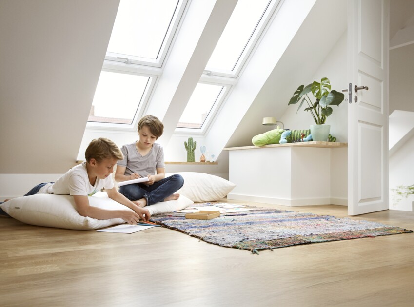 Ciekawym rozwiązaniem jest połączenie okien dachowych z oknami kolankowymi lub elementami doświetlającymi. Pozwalają one zwiększyć ilość przeszkleń, które mogą ciągnąć się od okna połaciowego do samej podłogi. Dzięki takiemu połączeniu uzyska się szeroki widok na zewnątrz, więcej światła dziennego oraz możliwość przewietrzenia pokoju nawet przy złej pogodzie. Jeśli poddasze jest ze ścianką kolankową, można zastosować pionowe okno kolankowe otwierane uchylnie – VELUX VFE lub nieotwierane VELUX VIU. Do poddaszy bez ścianki kolankowej przeznaczone są specjalne elementy doświetlające, montowane pod tym samym kątem, co okno – VELUX GIL/GIU.